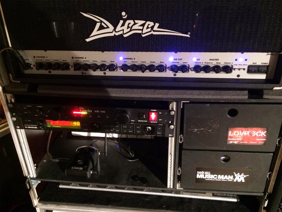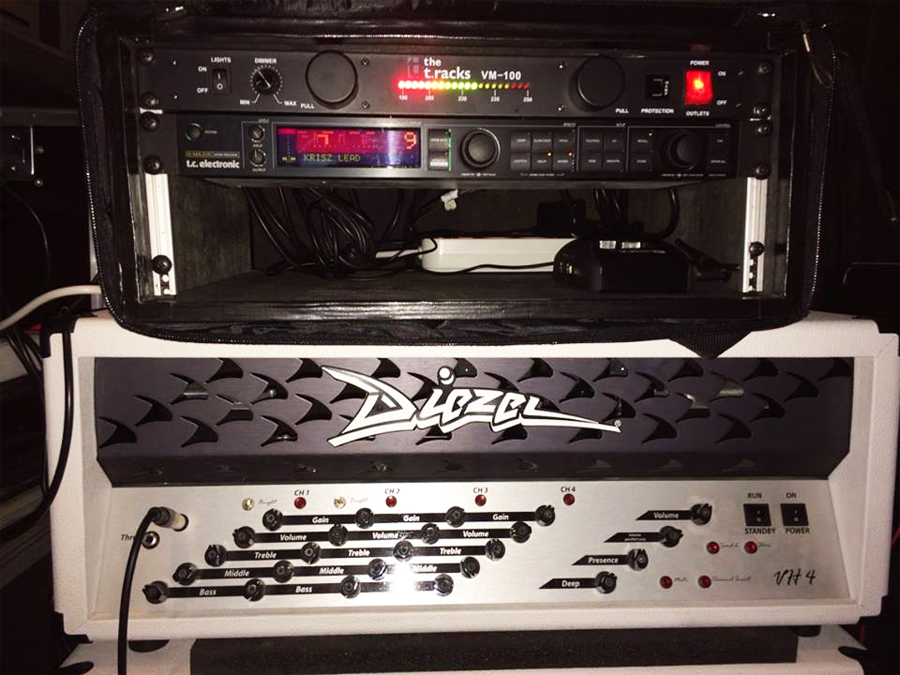 Kipróbáltam több utat, volt, hogy multiztam, volt, hogy kisvasutaztam, de idővel meguntam a stepp táncot (éneklés közben eleve kivitelezhetetlen), és a Diezel teljes MIDI-zhetősége miatt a legésszerűbb megoldásnak a MIDI-vel vezérelhető effektprocesszor alkalmazása tűnt. Az ár-érték arányban verhetetlen TC Electronic G-Major mellett döntöttem több mint 6 éve, amit azóta sem bántam meg. 70 ezer Ft-ért minden értelmes effekt stúdió minőségben, plusz hangoló, kell ennél több? Aligha! Az egész setupot egy Behringer FCB 1010 MIDI Controller-el vezérlem. Egyetlen lépéssel tudok csatornát váltani az erősítőn és ugyanakkor presetet is kapcsolni a G-Majoron, vagy éppen lenémítani a cuccot, ha arra van szükség. Nincs többé stepptánc, csak gyönyörű, kisimult homlok.