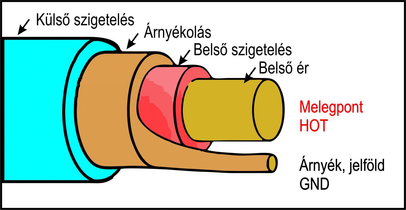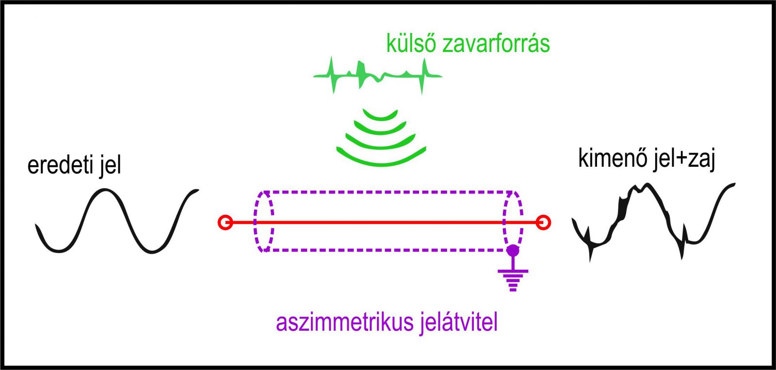 A dolgok megértéséhez meg kell ismerkednünk a két legelterjedtebb analóg jelvezetési móddal. Bármilyen elektromos jel továbbításához két vezetékre van szükségünk, gondoljunk csak a fizika órán mutatott zseblámpa izzós kísérletre. (Jó lett volna figyelni...) Két egyszerű vezetékkel összekötve még a házi hifi is rendkívül zajos lesz, mert a környezetünkben lévő száz és száz zavarforrás ontja magából a láthatatlan elektromágneses zavarokat. Ilyen például a falban lévő hálózati vezeték, szinte az összes háztartási gép, vagy akár a klíma is. Ezek az elektromágneses hullámok zavarjeleket indukálnak a mi remekbe szabott két vezetékünkbe. (Itt is jó lett volna figyelni fizikán: mi is az, az indukció? Nem magyarázom el, Gúgli a barátod!) A villámok ellen is a földelés véd, itt is valami hasonló megoldást kellene kitalálni! És tényleg, milyen kézenfekvő, hiszen az összeköttetésre használt két kábelünk közül az egyik eleve a földpotenciálra van kötve. vegyük körbe vele mintegy ernyőként a másik vezetéket, s így eltüntethetjük a zavarjeleket. (Legalábbis egy részét). Szőjünk hálót a vezetékünk köré, természetesen egy szigetelő réteggel elválasztva egymástól, nehogy összeérjenek, s a fémháló árnyékot vet vezetékünkre, nem engedi a közelébe a zavarjeleket. Hurrá! Feltaláltuk az árnyékolást! Amikor úgy vezetjük a hangfrekvenciás jelet, hogy egy ér köré árnyékolást teszünk (és így lesz meg a két vezeték a jeltovábbításhoz), aszimmetrikus jelvezetésről beszélünk. A kábel neve is egy eres árnyékolt kábel. A középső vezetéket melegpontnak (HOT) a külső fémhálót árnyékolásnak, vagy jelföldnek (GND) nevezzük.