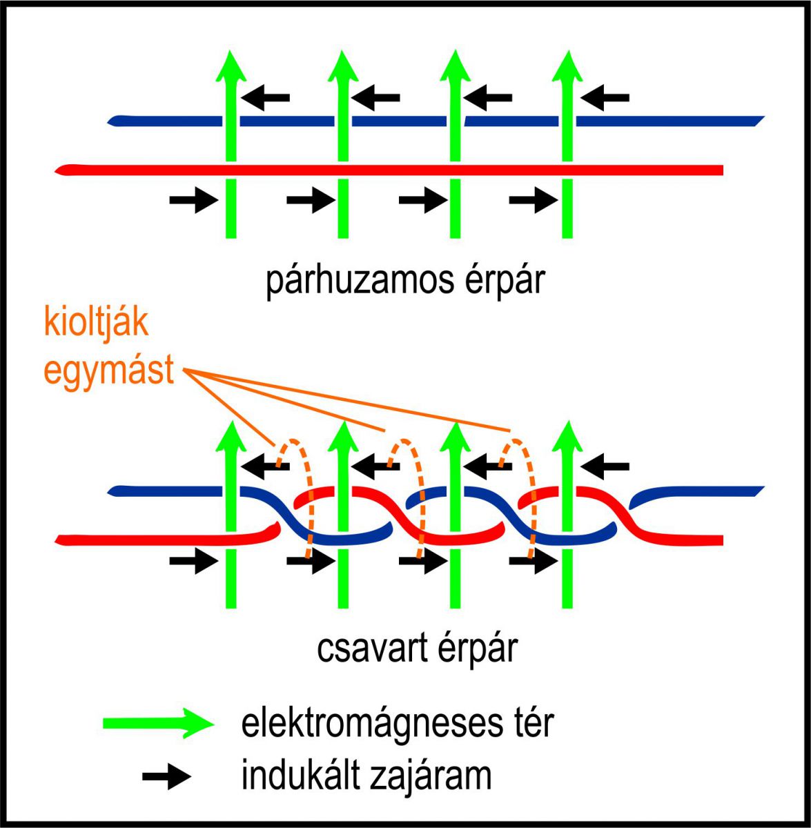 Valami jobb megoldás kell! Vegyünk két vezetéket, ráadásul sodorjuk össze őket. A vezetékek összecsavarása már önmagában is jelentősen csökkenti a zaj, zavar hatását. Egyenes érpár esetén az elemi vezetékdarabokon mindig ugyanazzal a fáziskülönbséggel történik a külső zavarforrás hatására az indukció, így összegződik a zavarás. A sodrott érpárnál, ahol az elemi szakaszokon a folyamatos 180 fokos fázisfordítás kioltja a szomszédos vezetékdarabon indukált zajt ill. zavart, jelentősen csökkentve azt.