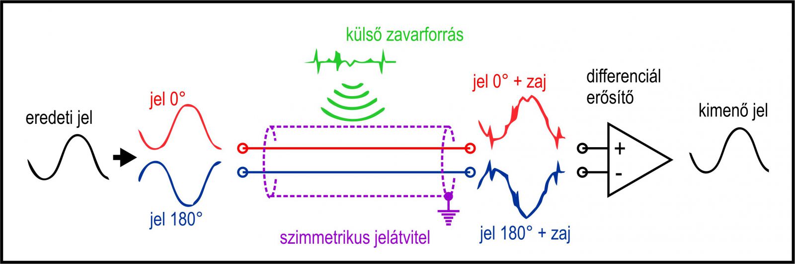 A két jel egymás tükörképe, azaz szimmetrikusak egymásra. Az ábrán piros a fázisban, kék az ellenfázisban lévő jel jelölése. Adjuk rá a két ér + árnyékolásból álló szimmetrikus csatornánkra, s nézzük, mi történik a kábelen! A külső zavarforrás a jelföldhöz (árnyékoláshoz képest) mindkét vezetéken ugyanolyan, azaz fázisban lévő zavarjeleket indukál. (Persze a csavart vezetékpár ezt csökkenti jócskán, de meg nem szünteti.) A kábel kimenetein lesz egy fázisban lévő jelünk a fázisban lévő zajjal, és lesz egy ellenfázisú jelünk szintén fázisban lévő zajjal. Jó ötlet ez? Pont az előbb mondtam, hogy ha a zaj megjelent a hasznos jelen, az már többé szét nem választható. Adjuk össze a két jelet! A két ellenfázisú jel összeadva pont kioltja egymást, és marad két zaj, azaz kétszeres zajfeszültség. (Matematikusoknak: [+jel+zaj] + [-jel+zaj] = 2 zaj ) Nem pont ezt akartuk! De aggódásra semmi ok: vonjuk ki őket egymásból! A fázisban lévő jelből kivonjuk az ellenfázisút, akkor pont kétszeres nagyságú, fázisban levő jelet kapunk. A két kábelen a zaj a kivonás miatt azonban pont kioltja egymást! (Matematikusoknak: [+jel+zaj] - [-jel+zaj] = +jel +zaj +jel -zaj = 2 jel ) Hurrá! Feltaláltuk a szimmetrikus jelátvitelt!