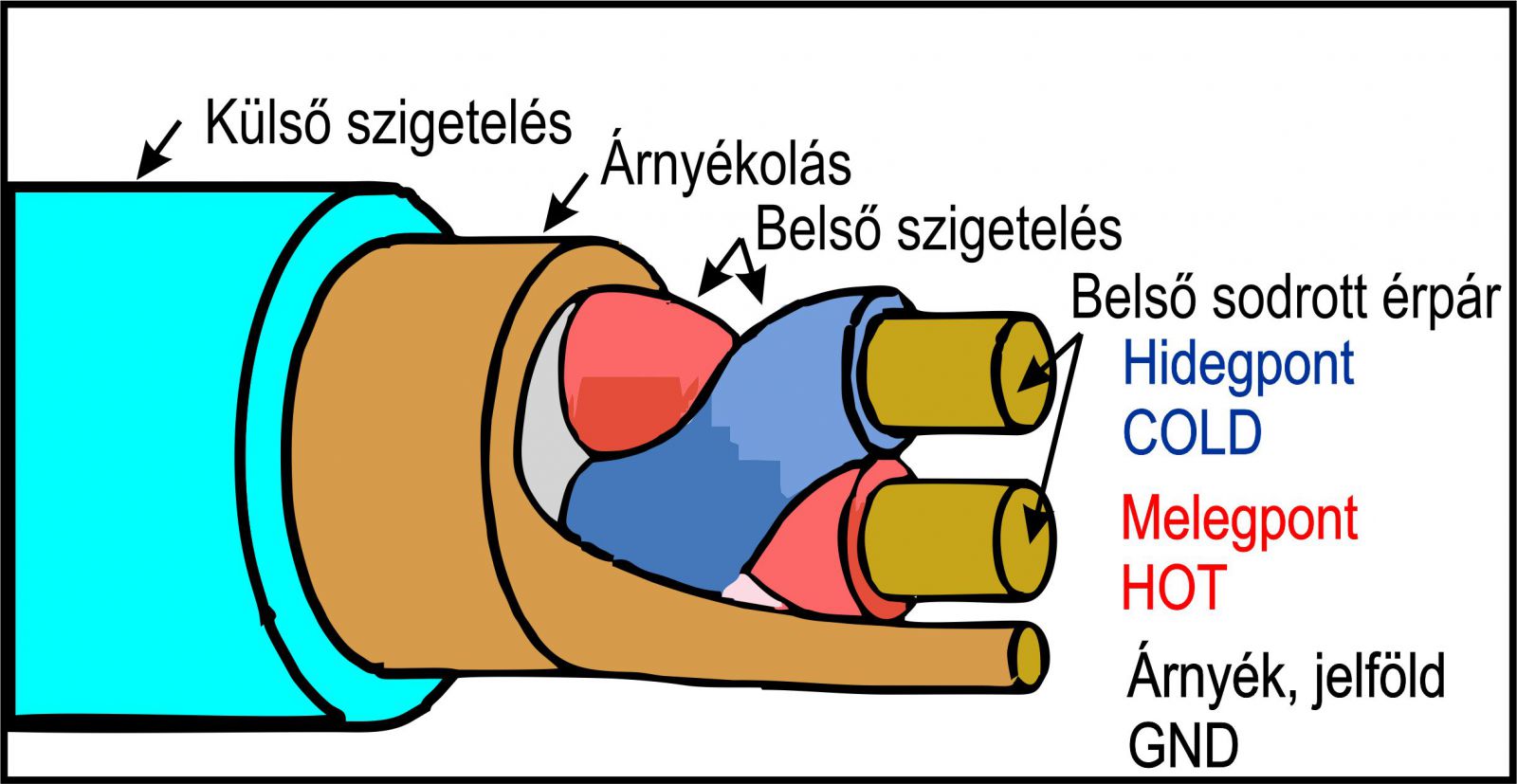 Persze ezen még sokat javíthatunk. Az előbb elkészített árnyékolásunkba tegyünk be ezt a sodrott érpárt, így növelve a védelmet. A kábel neve is két eres árnyékolt kábel. Az egyik középső vezetéket melegpontnak (HOT), a másikat hidegpontnak (COLD) hívjuk, a külső fémhálót árnyékolásnak, vagy jelföldnek (GND) nevezzük. Ez a szimmetrikus kábel, vagy szimmetrikus jelvezetés.
