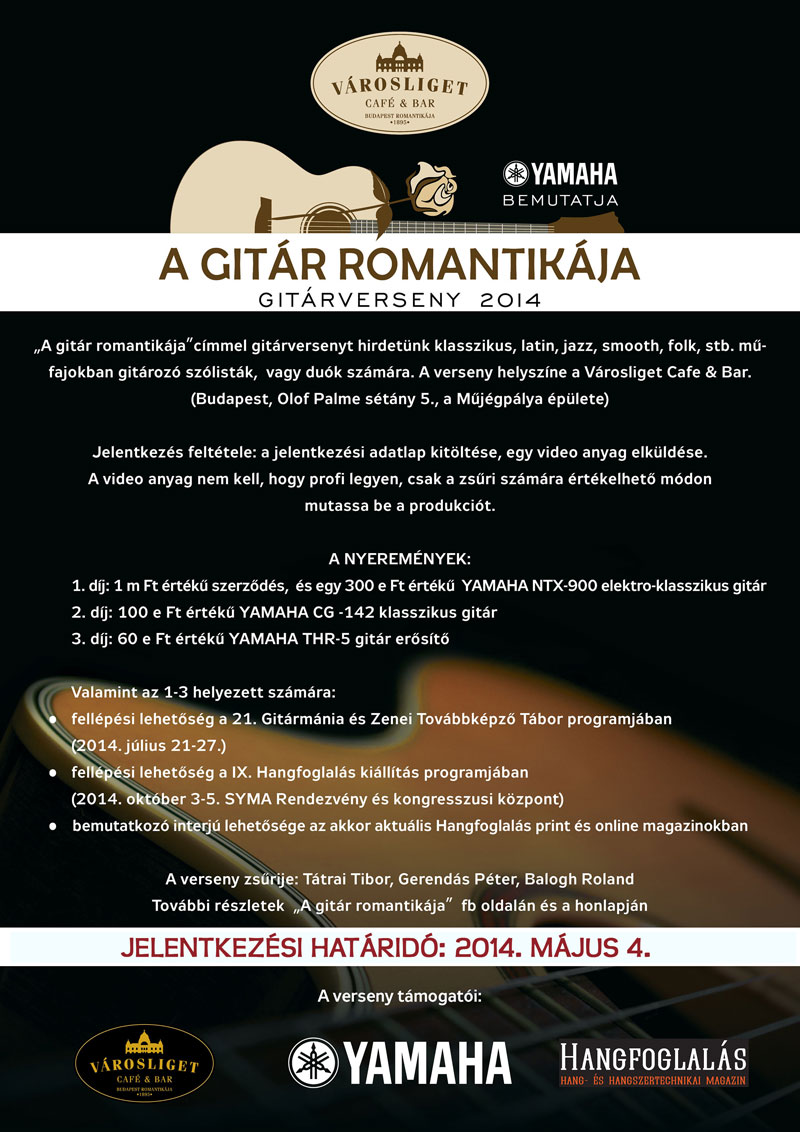 „A Gitár Romantikája” címmel gitárversenyt hirdet klasszikus, latin, jazz, smoot, folk, stb. műfajokban gitározó szólisták, vagy duók számára a Városliget Cafe & Bar. (Budapest, Olof Palme sétány 5., a Műjégpálya épülete)