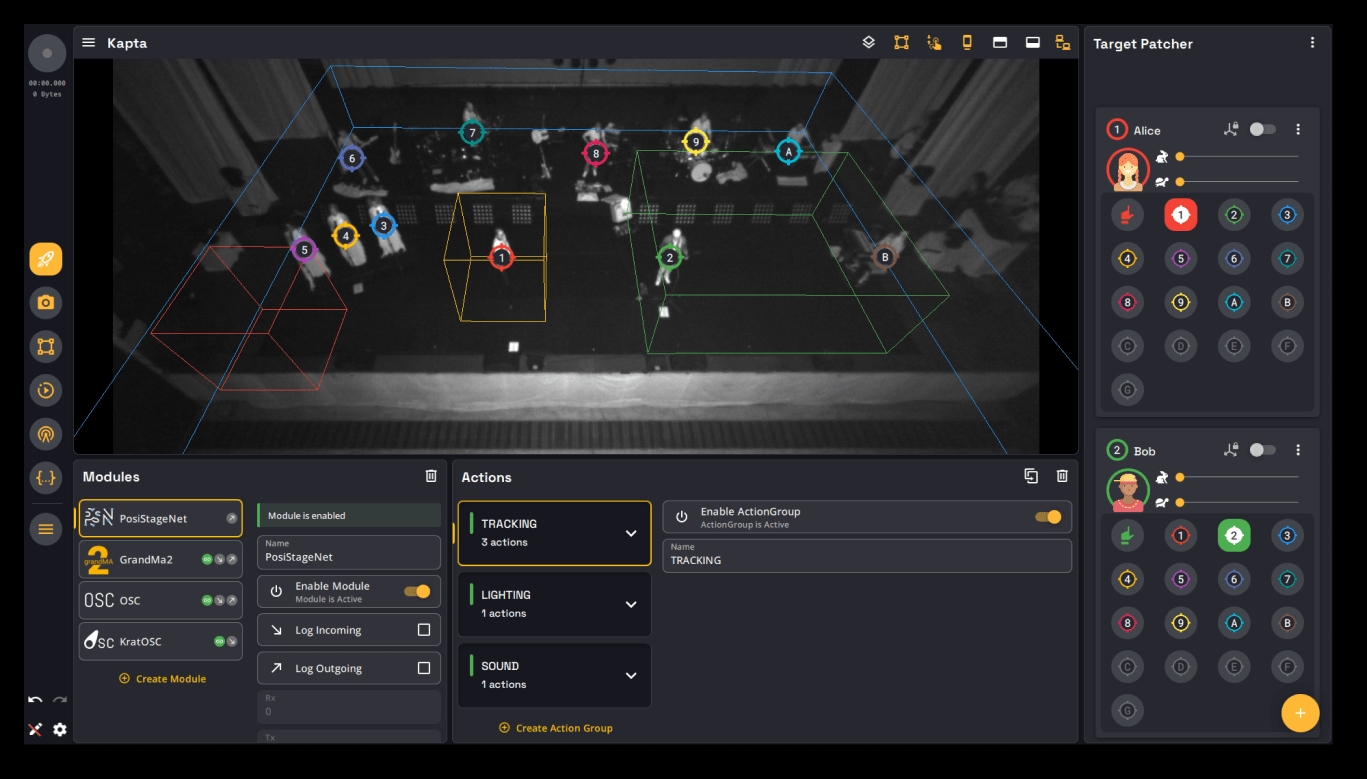 KRATOS: Egy saját fejlesztésű, felhasználóbarát kezelőfelület, amely lehetővé teszi a vizuális kalibrációt, a követési zónák beállítását, valamint az automatizált cue-k és események indítását mozgás alapján (például amikor egy előadó egy zónába lép, aktiválódik egy fény- vagy hanghatás).