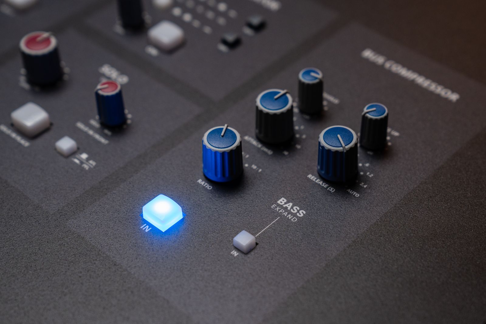 Bár az eredeti 4816-SE ben is volt kompresszor, ami egy sok ledes gain redukció kijelzéssel rendelkezett, ezt a kompresszort egy picit átdolgozták, és megkapta azt a setupot, amit a 8024HE nagy pultba is raktak. Megkapta a ledek helyett a master kijelző alá a hozzá illő, szép és autentikus mutatós műszert. Tényleg élhetőbb így szerintem. Van itt még valami finomság. A Bass Expand. Ez nem más mint egy felüláteresztő szűrő. Igaz, hogy fix paraméter és vagy használod, vagy nem, de azért azt tudjuk a mindennapokból, hogy a mélytartomány dinamikázása jóval többet érdemel, mint hogy egy kalap alatt molesztáljuk a láb cin hangjáva. NAGYON JÁR A TAPS.