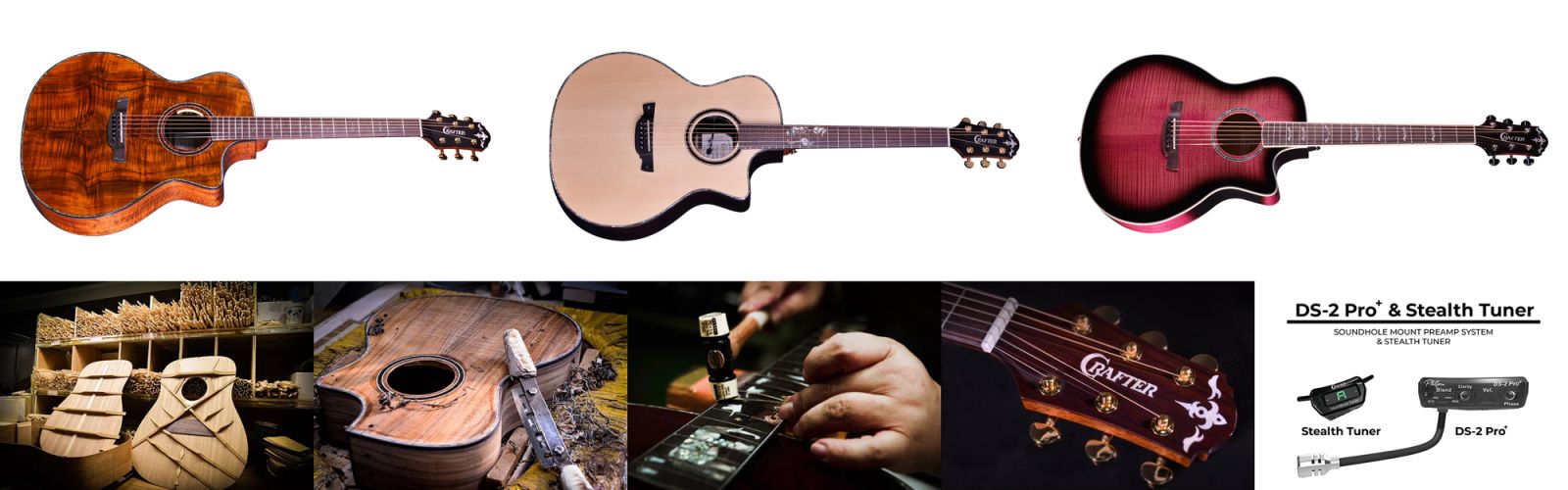 A Crafter gitárok gondosan válogatott, prémium minőségű faanyagokból készülnek (lucfenyő fedlap, mahagóni hát és oldallapok, rózsafa fogólap, juhar és egzotikus betétek), amelyek mind hozzájárulnak a jellegzetes hangzáshoz és a vizuális szépséghez. A testformák között megtalálható a nagy hangerőt adó dreadnought, a kiegyensúlyozott grand auditorium, valamint az intimebb hangzású parlor gitár. Így minden zenész megtalálhatja a stílusához illőt.