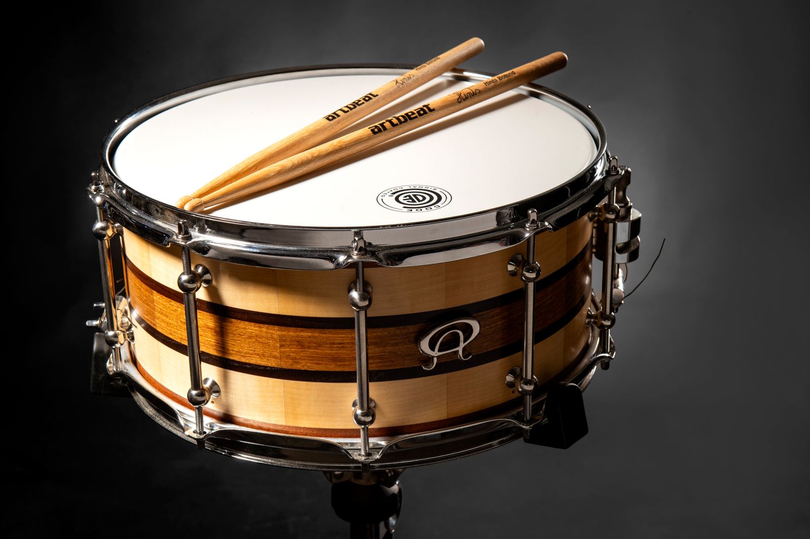 A szóban forgó modell – egy 14” × 6,5” hibrid pergő – az AngelDrums egyik legösszetettebb konstrukciója. A test felépítése négy különböző fafajtát egyesít: a középső gyűrűt indonéz rózsafa adja, ezt hőkezelt kőris, hegyi jávor és mahagóni öleli körül. A kombináció első pillantásra is különleges: a sötétebb rózsafa erezete és a világosabb jávor kontrasztja látványosan rajzolja ki a hangszer formáját. A lakkozás karcálló, selyemfényű, ami kiemeli a fa természetes rajzolatát, ugyanakkor megőrzi annak meleg tónusát. Minden részlet, a babák elhelyezésétől a szellőző furat precíz kivitelezéséig, az emberi kéz és szakmai tudás harmóniáját tükrözi - különösen a test és a vasalat illesztésében figyelhető meg ez a precizitás.