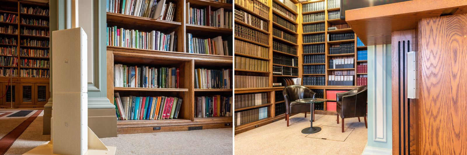 A K-array hangszórórendszert a 2B Heard igazgatója, Dave Wooster modellezte. A tervek szerint a rendszernek képesnek kellett lennie arra, hogy a terem minden pontján tisztán és teljeskörűen adja vissza a beszédet és a zenét a központi vetítővásznon és a terem két oldalán elhelyezett kiegészítő HD monitorokon megjelenő képhez kapcsolódóan. Az épület műemlékvédelmi státuszához igazodva a hangrendszert két egyedi állványokba épített Rumble-KU26 mélynyomó, valamint a terem két oldalán elhelyezett egy-egy Vyper-KV52 line-array alkotja. Ezenkívül a könyvtár fala mentén, az LCD monitorokat tartó pódiumokon is megbújik diszkréten pár fél méter magas Vyper-KV25 line-array hangsugárzó.