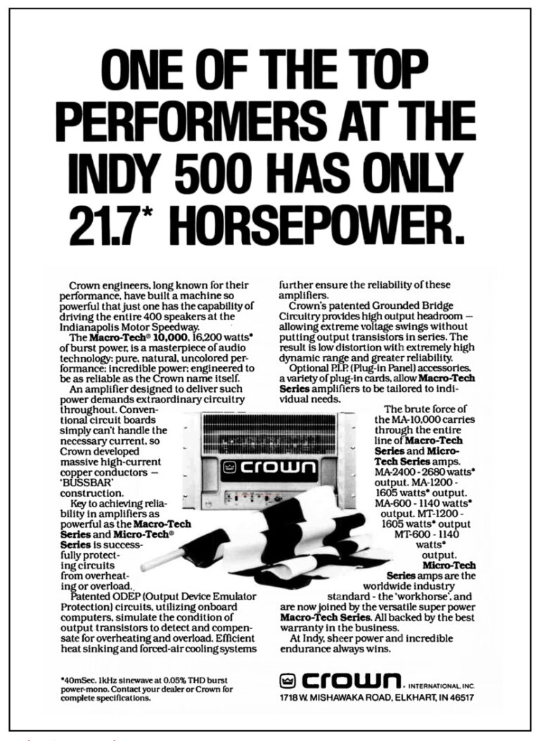 Az MA10000 10 000 watt teljesítményt biztosít 465 hangszóró meghajtására az Indianapolis 500 Motor Speedway versenypályán. A kép forrása: museumofmagneticsoundrecording.org és az eredeti képszolgáltató.